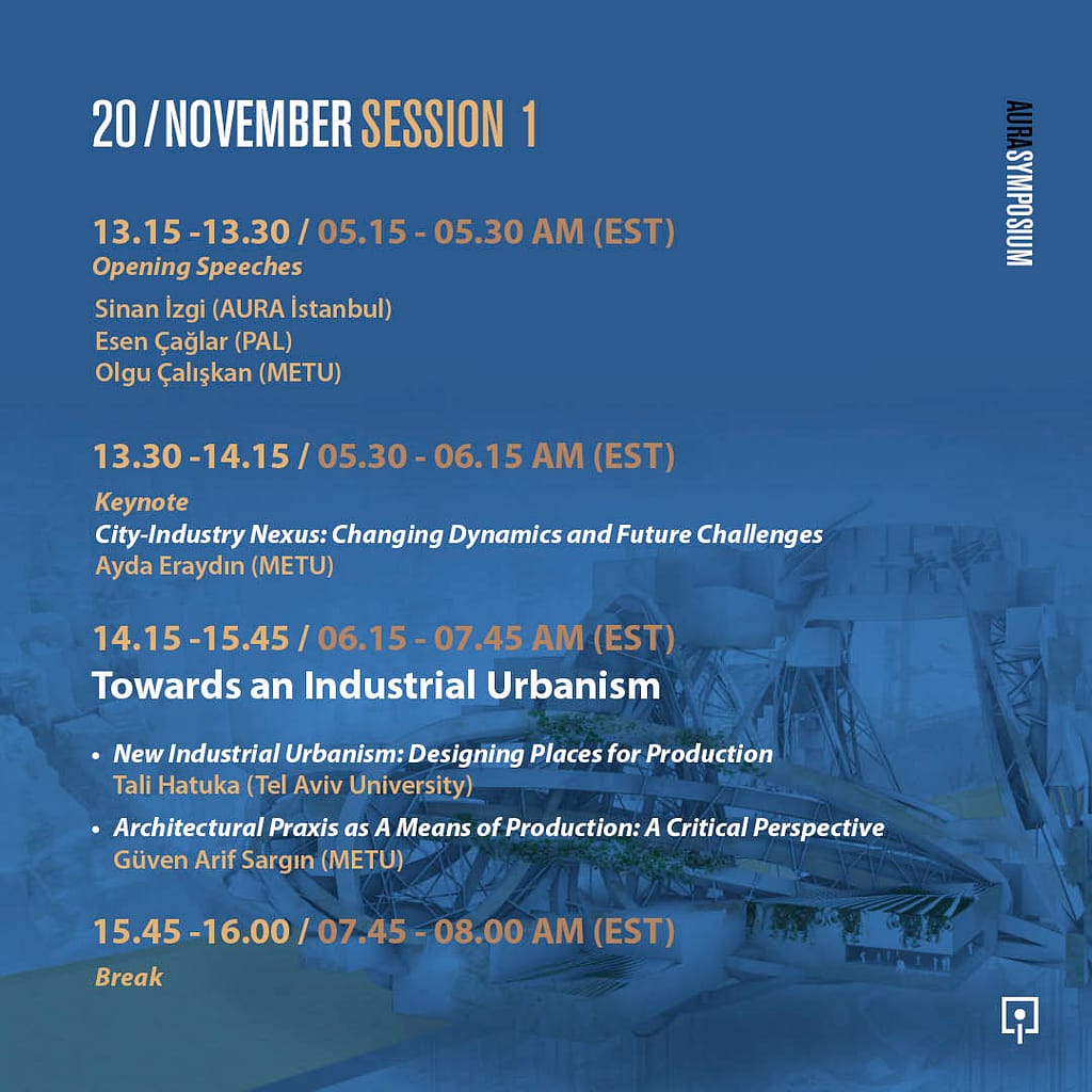 AURA Sempozyum; MIT ve Tel Aviv Üniversitesi işbirliği ile oluşturulmuş “Endüstri Şehirciliği” grubuna referansla ortaya çıkmış olan, ODTÜ Kentsel Tasarım ve Mimari Tasarım Yüksek Lisans Programları ile Politika Analiz Laboratuvarı (PAL) işbirliğinde çok disiplinli bir platform olarak tasarlanan “Endüstri Şehirciliği_Türkiye” platformunun katkıları ile düzenleniyor. Sempozyumda, mimarlık, planlama ve iktisat alanlarından akademisyen, araştırmacı ve strateji uzmanları konuşmacı olarak yer alıyor.